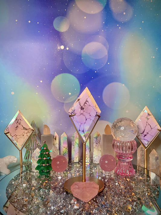 Rainbow Fluorite Diamond ♦️ on Stand (w/natural hole repaired)