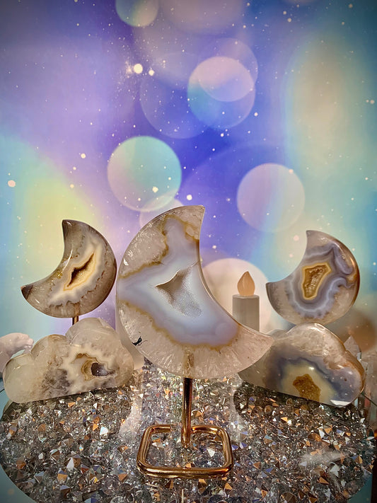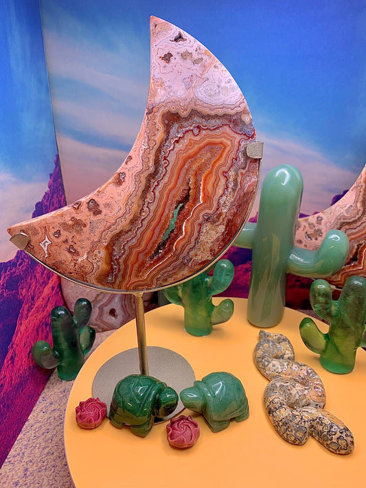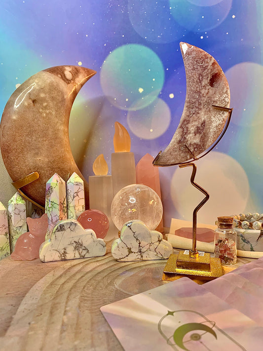 Pink Amethyst with Flower Agate Crescent 🌙 Moon in Stand