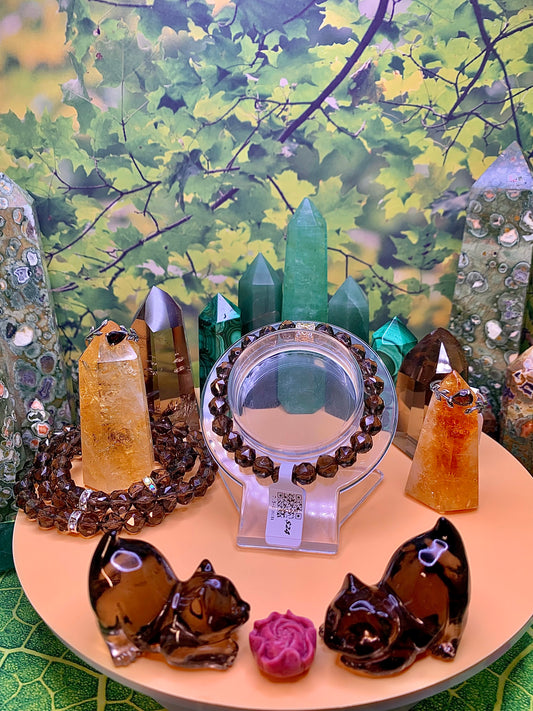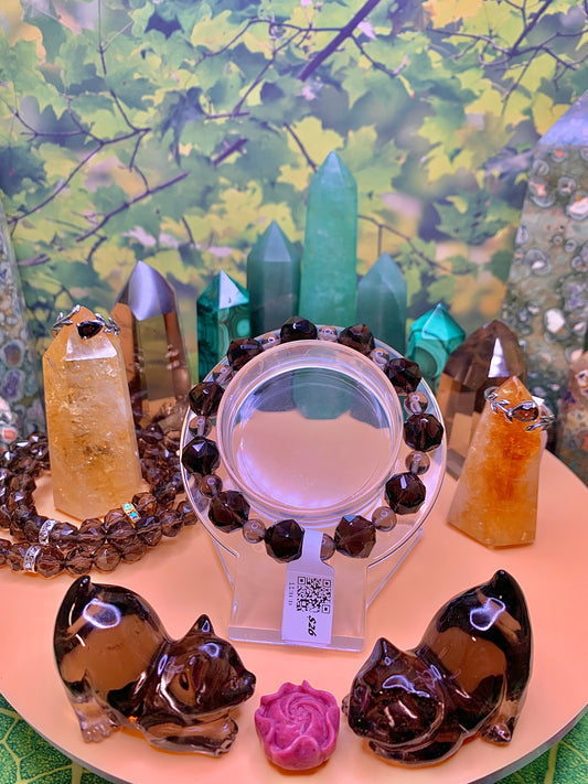 Smoky Quartz Faceted Bead Bracelet 8-8.5mm with Silver Rhinestone Spacers