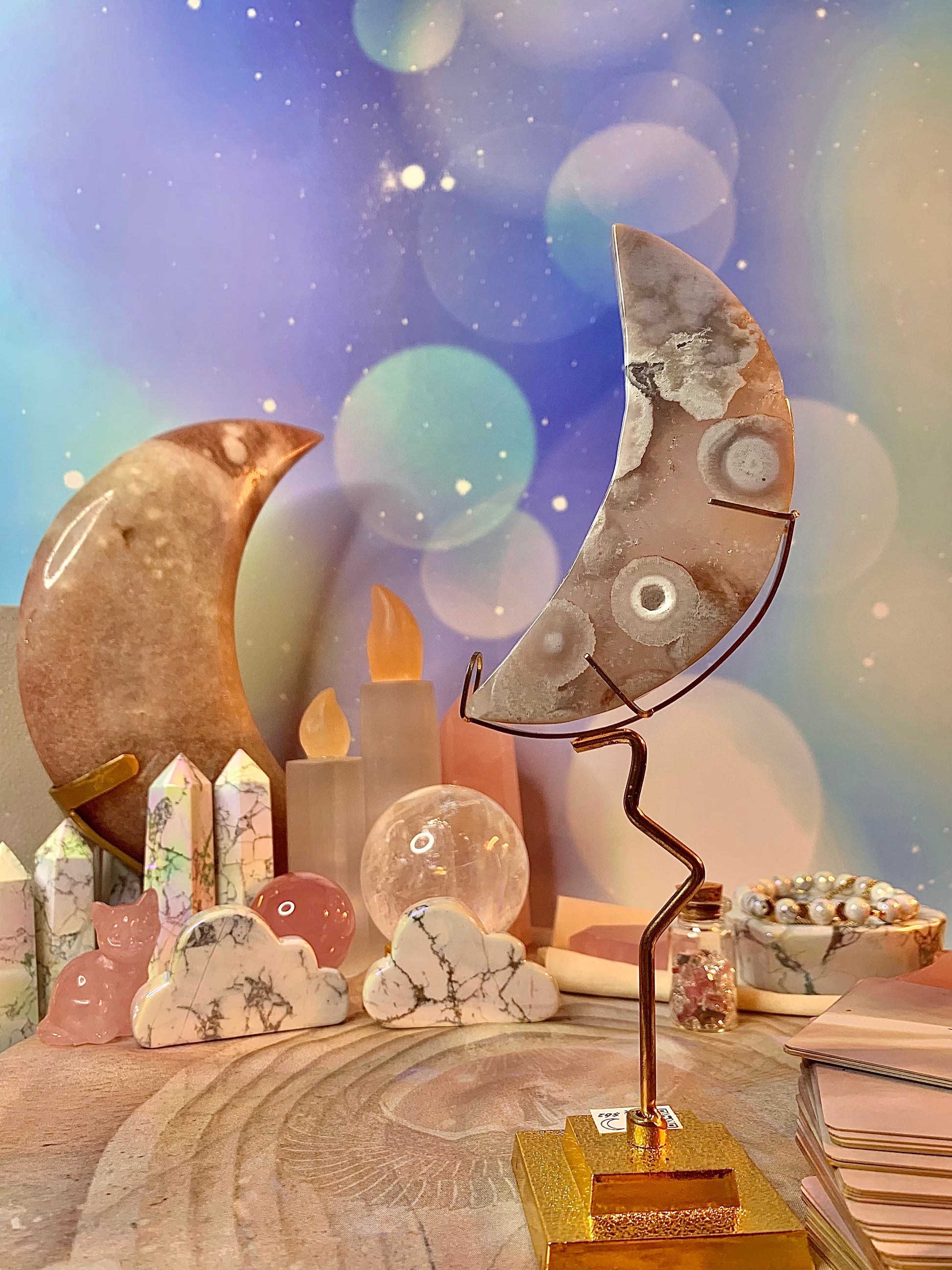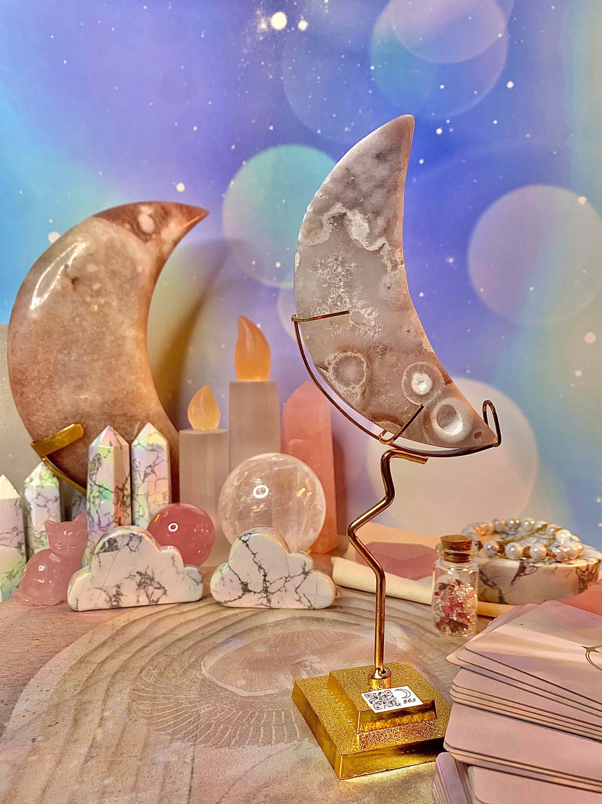 Pink Amethyst with Flower Agate Crescent 🌙 Moon in Stand:
