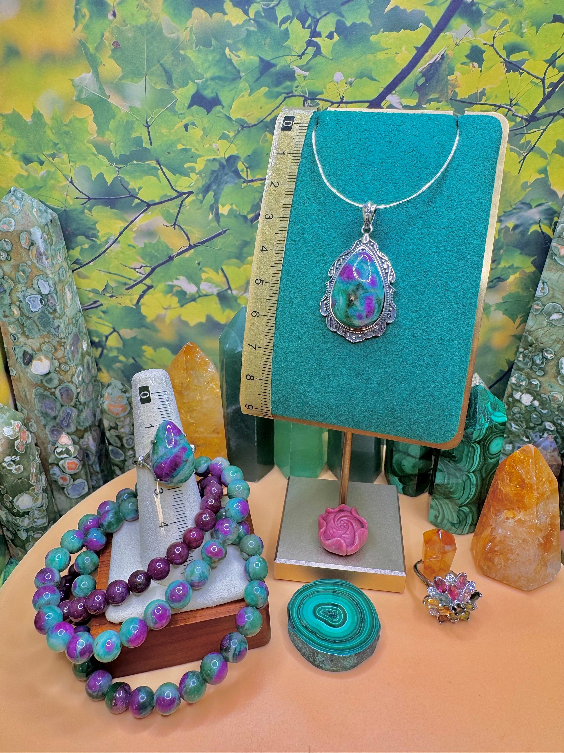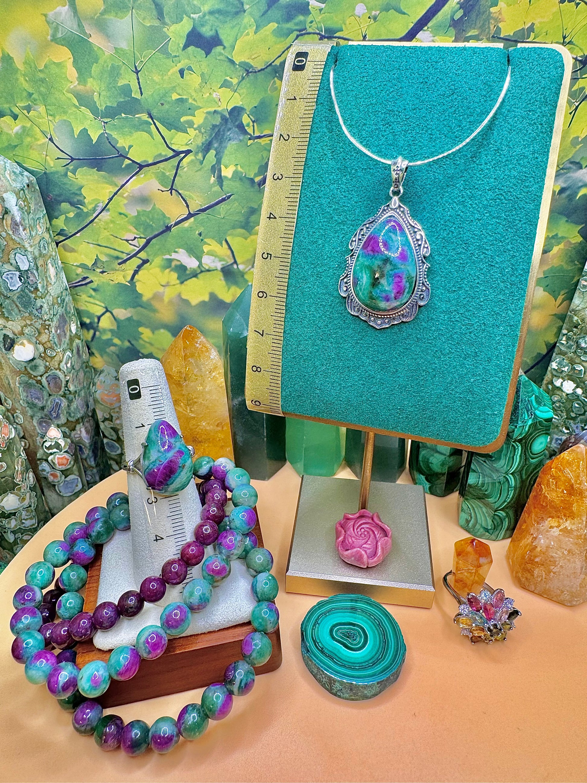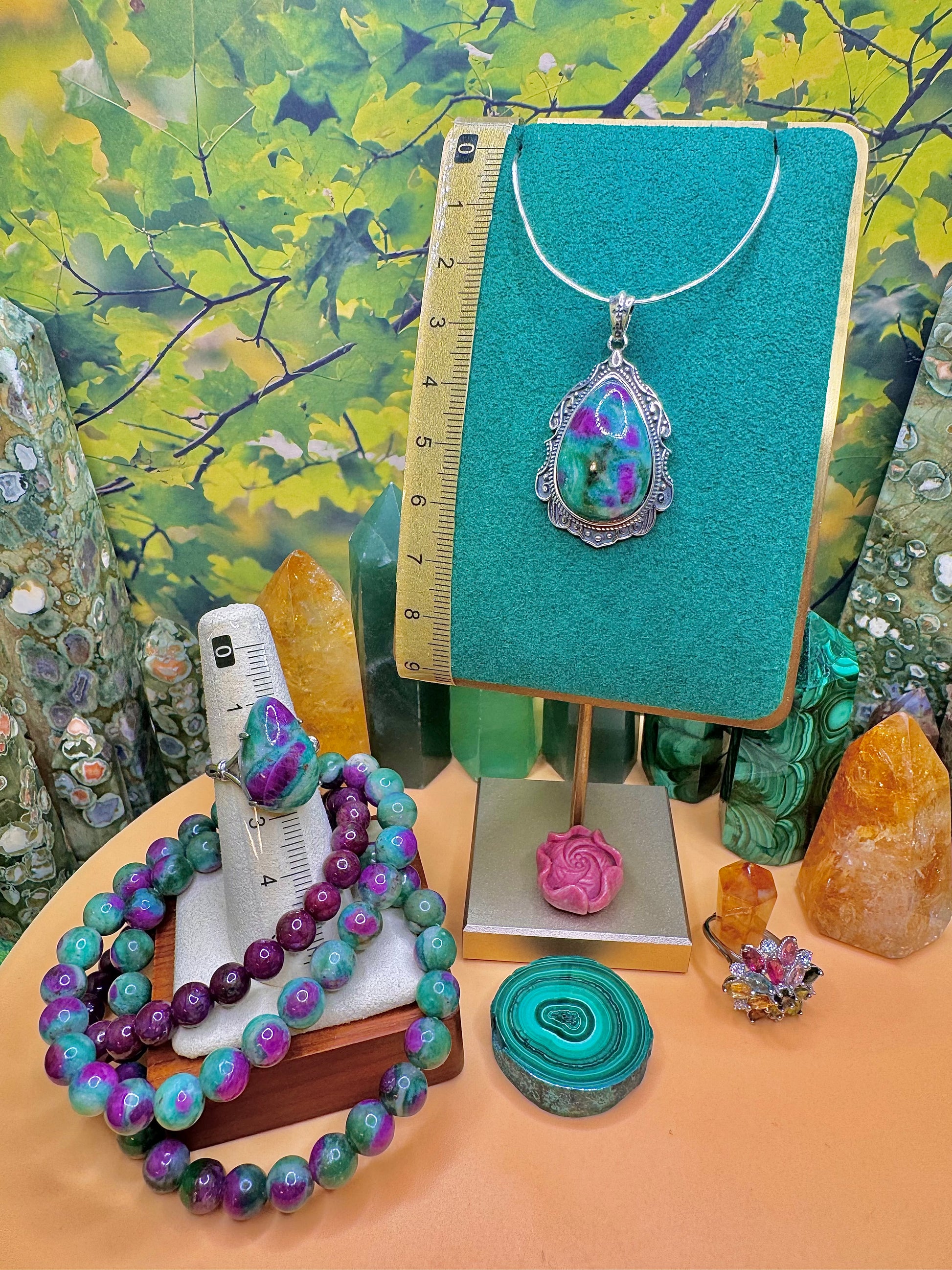 Ruby Fuchsite provides us with courage and strength to endure hardship and trauma. It offers emotional support while nourishing our soul. With its strong connection to Earth energies, it can revitalize and rejuvenate us, balancing our energy and healing our nearts. It helps us to discard unwantec objects and encourages us to treat our emotional well-being as a vital aspect of our spiritual growth.