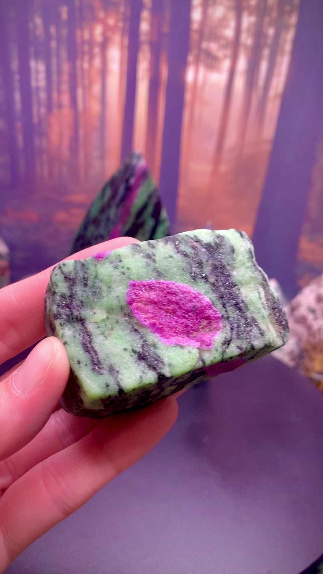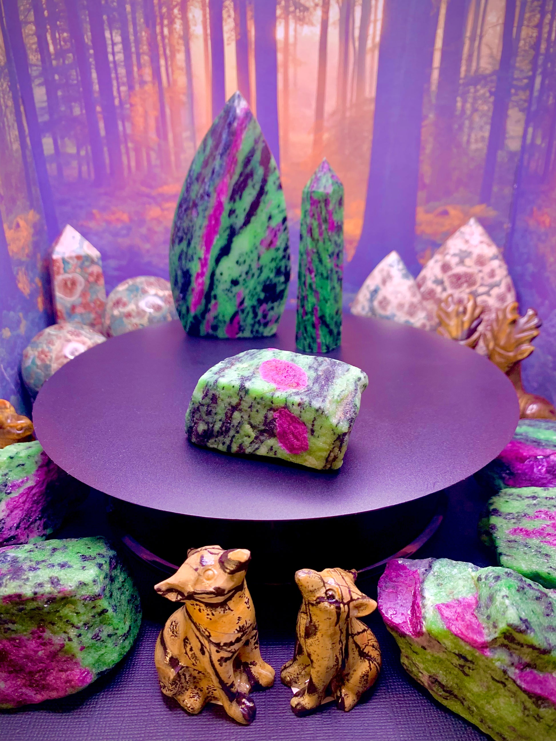 Ruby Zoisite is a manitestation stone, providing us with the strength & guidance to accomplish our dreams. It aligns with our Heart & Third Eye Chakra, deepening our understanding of the negativity that we may harbor & how to overcome it. It is considered to be a stone of discovery, helping us, who have just started our 'awakening' & spiritual journey, to better understand ourselves.