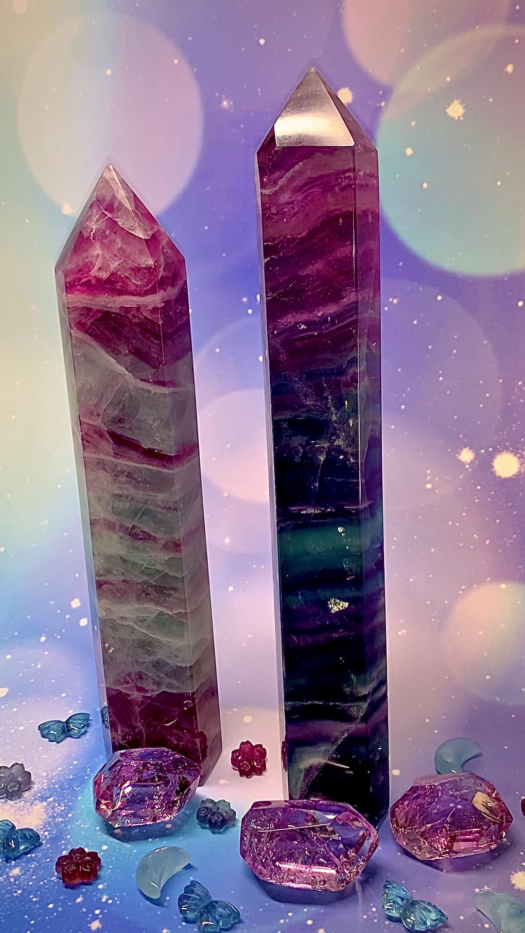 This listing is for the Watermelon Fluorite Tower shown in photographs on the left-hand side. It is the lighter color option of the two.
